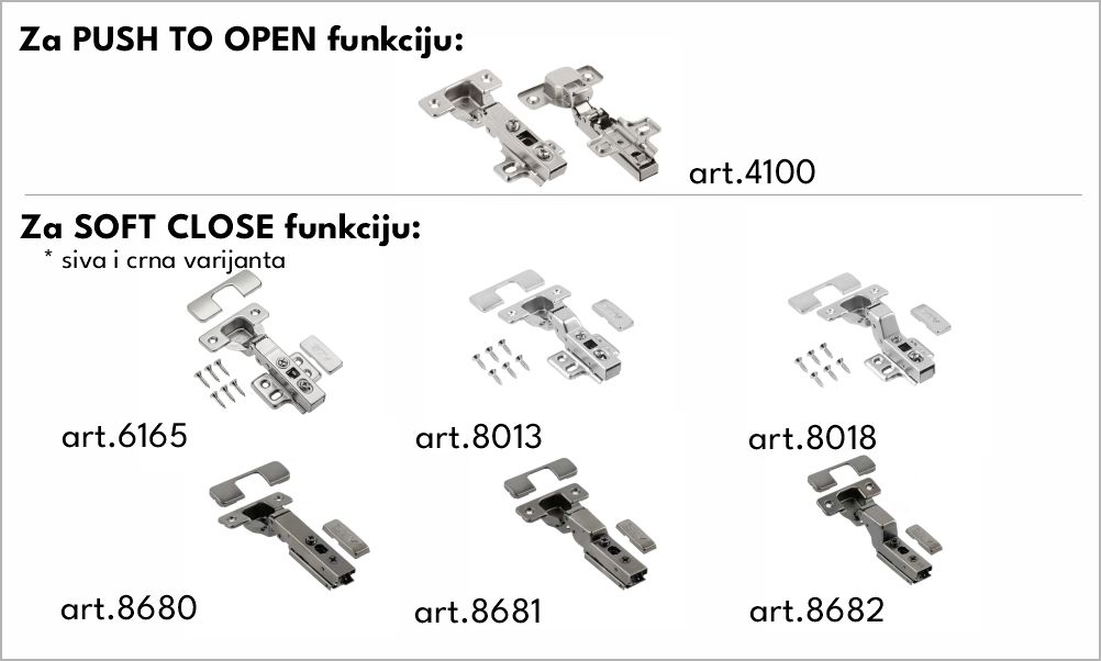 U zavisnosti od tipa šarke za koju se odlučite ovaj mehanizam imaće SOFT ili PUSH način otvaranja.